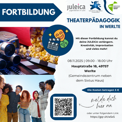 Dann melde dich jetzt an für die Fortbildung in Theaterpädagogik am 8. November 2025 im Gemeindezentrum Werlte!